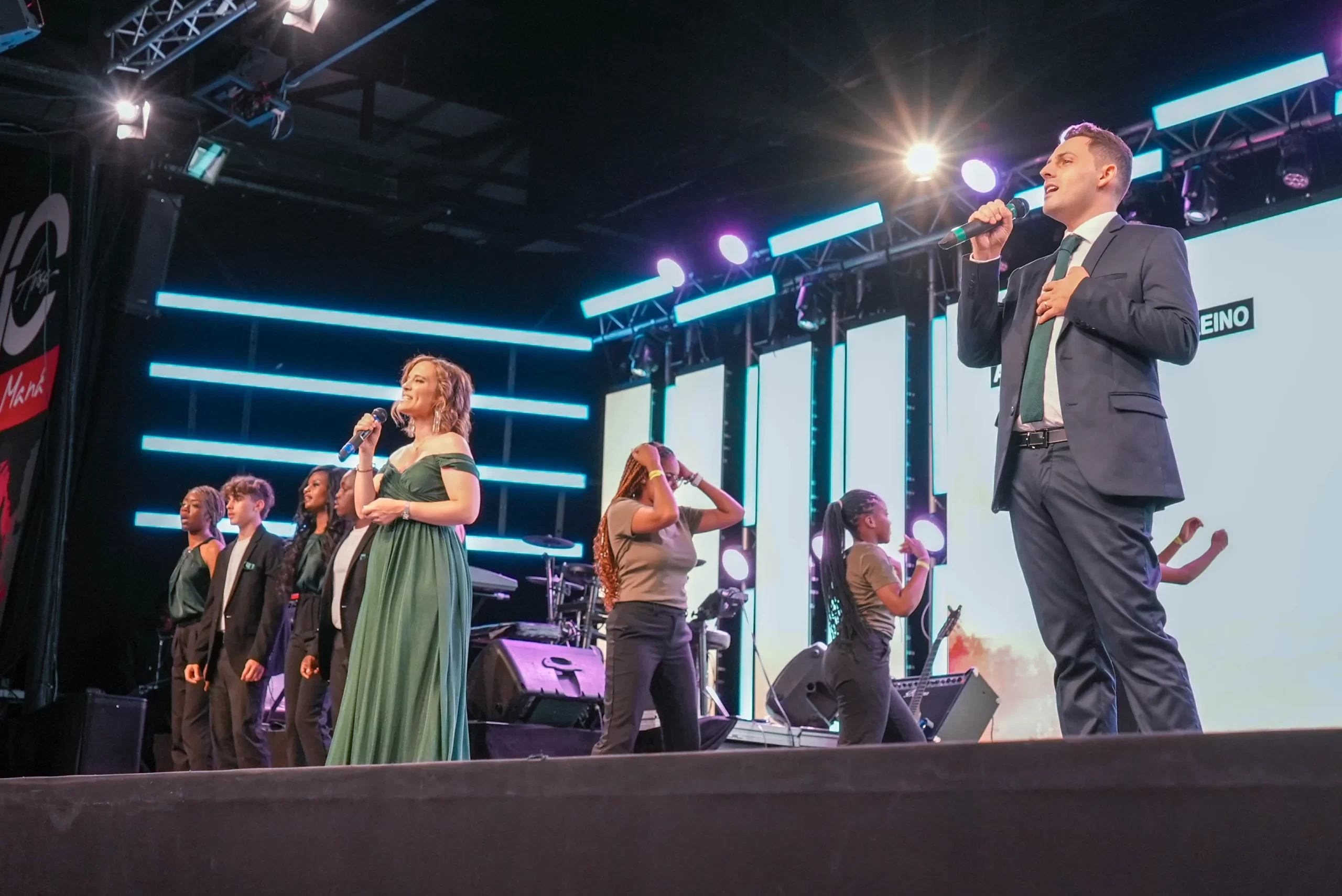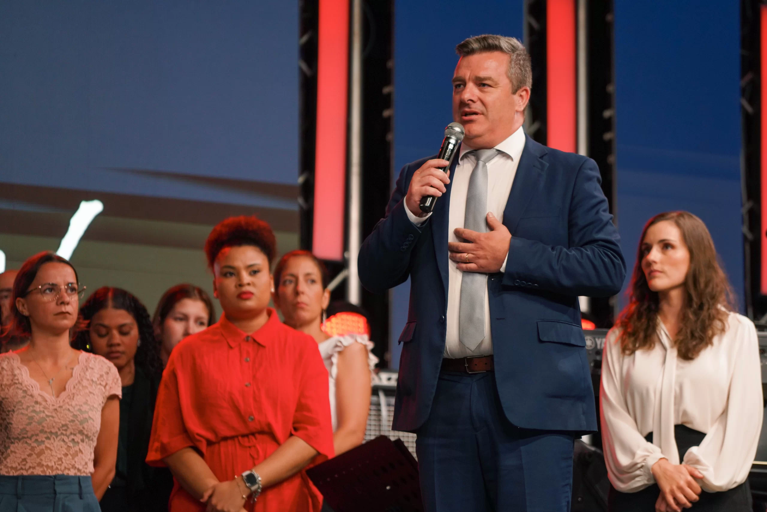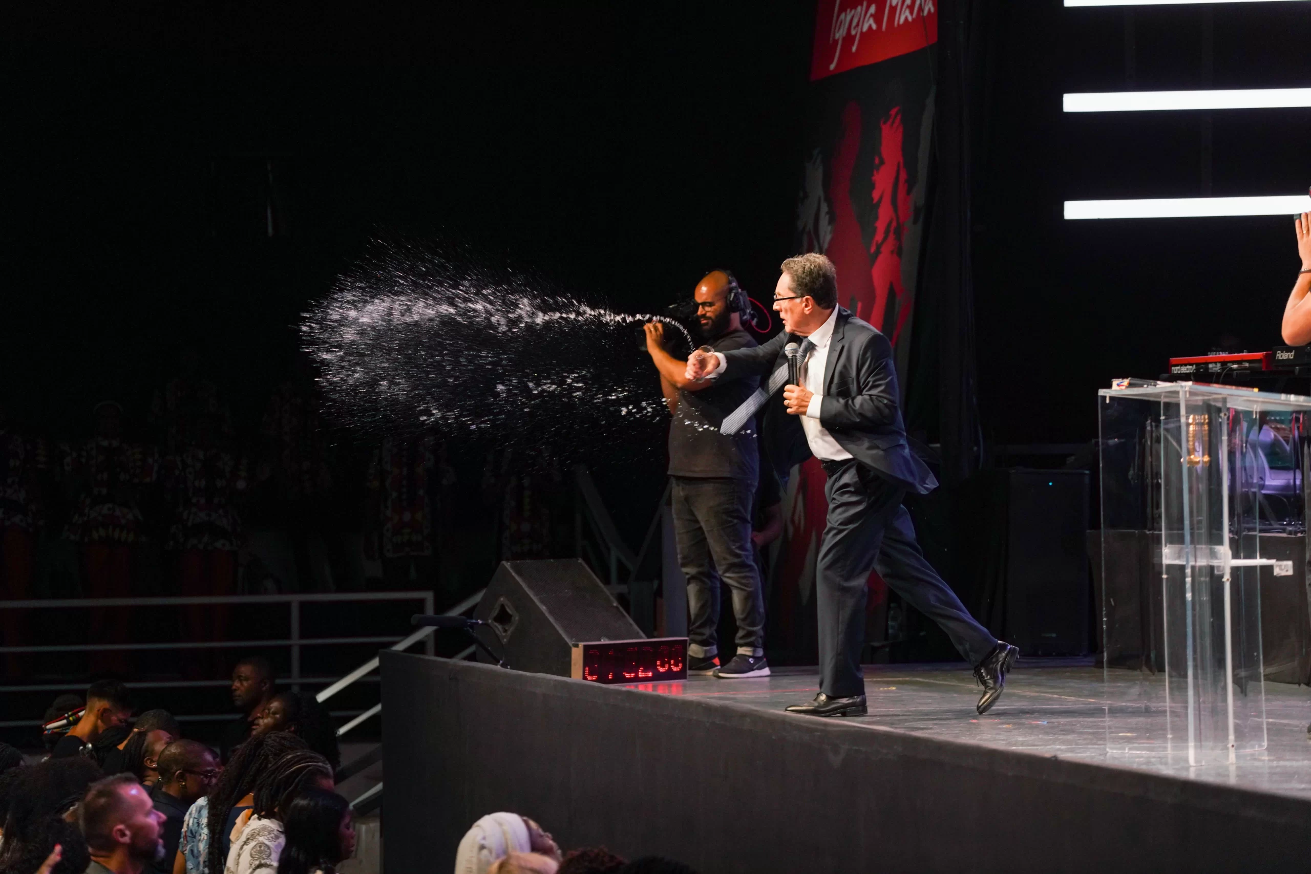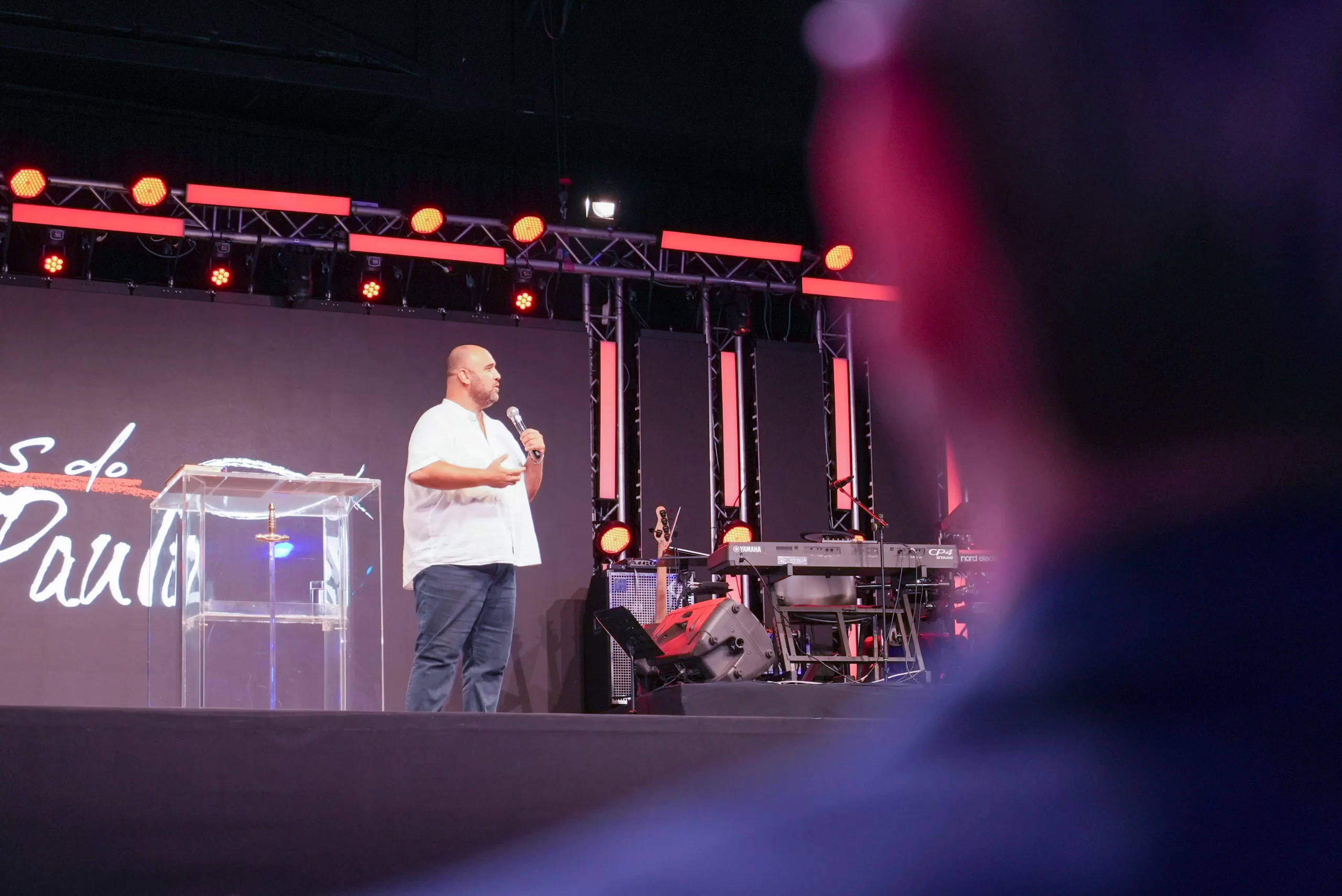 O Apóstolo, juntamente com a Bispa Samara de Jesus, convidou todos os professores da Escola Ministerial ao palco, destacando a importância desse e de outros cursos na formação espiritual e no crescimento dos crentes.